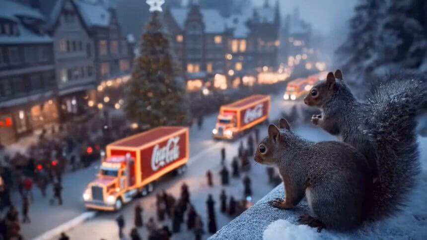 A 2025-ös verzióban a Coca-Cola okosan kerülte el az emberi alakok megjelenítését, miután a tavalyi évben a határokat feszegette a mesterségesen létrehozott alakokkal. Ezúttal jegesmedvék, nyulak és lajhárok figyelik a piros kamionokat, amint azok átszelik a havas erdőket, hogy időben leszállítsák az üdítőket. Az állatokra építő koncepció technikailag sokkal egységesebb: a kamionok kerekei most tényleg forognak, a fények természetesebbek, és a látvány összességében koherensebb, mint tavaly.